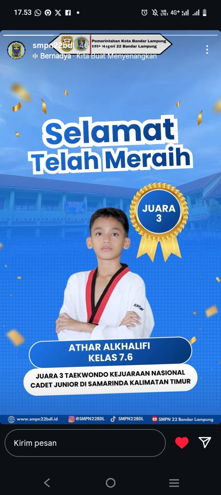 Bandar pampung-Siswa SMPN 22 Bandar LampungAthar al Khalifi meraih Juara 3 Perunggu perwakilan provinsi Lampung lomba Taekwondo kejuaraan nasional Cadet junior tingkat provinsi di Samarinda Kalimantan Timur.