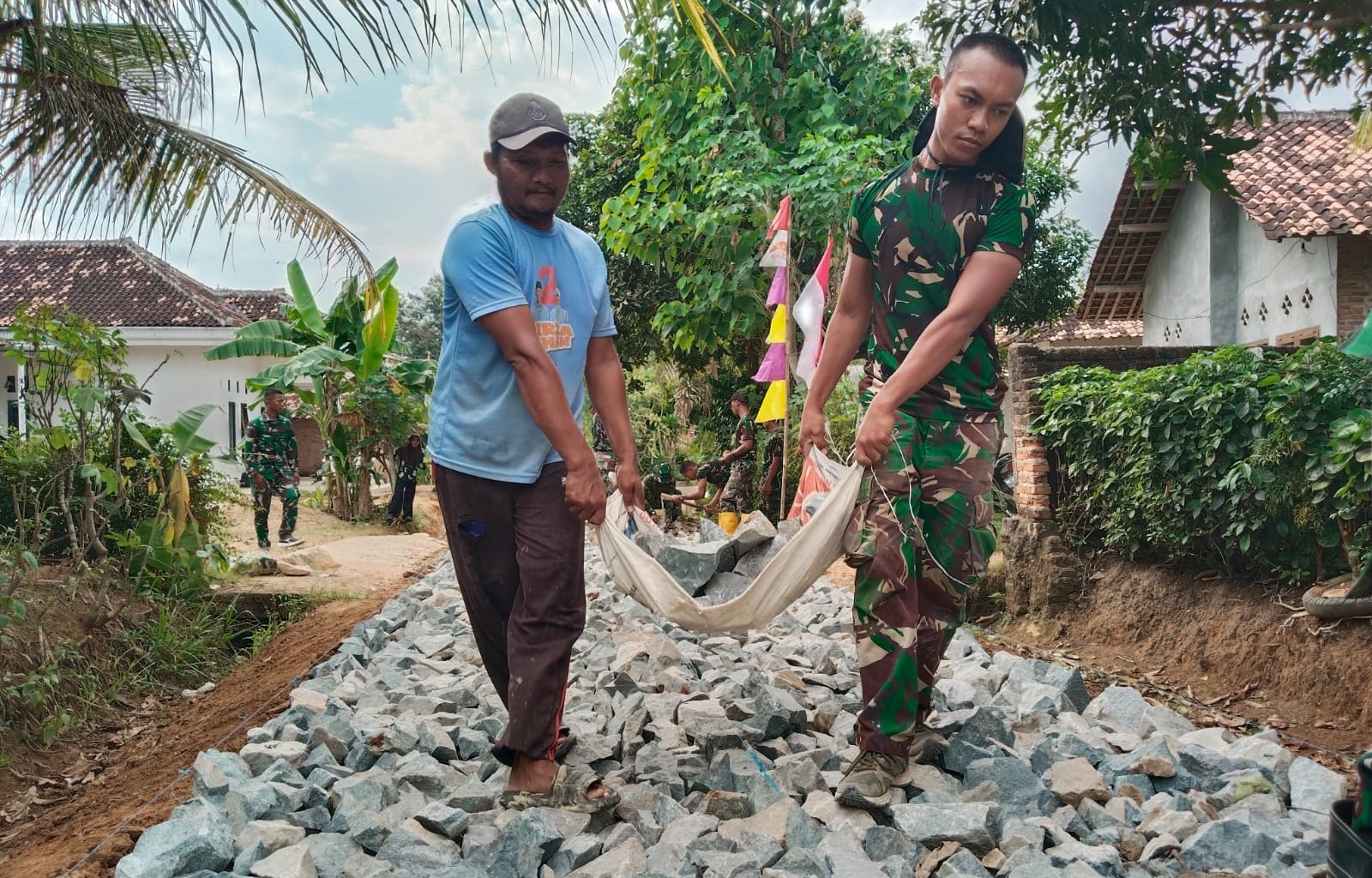 Tampak anggota Satgas dan masyarakat saling bahu-membahu mengangkat batu-batu besar menggunakan sarana angkut seadanya untuk ditempatkan di badan jalan yang sedang dikerjakan. Mereka bekerja di bawah cuaca cerah penuh semangat, menyatu dalam kebersamaan.