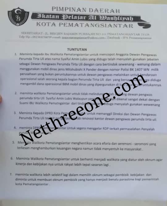 Pematangsiantar-Sumut | Netthreeone – Viral di media sosial terkait kinerja anggota Dewan Pengawas PDAM Tirtauli Kota Pematangsiantar Syaiful Amin Lubis yang dianggap telah menyalahgunakan jabatan dan semena-mena dalam menggunakan mobnas, Ikatan Pelajar Al Washliyah (IPA) Pematangsiantar pun melakukan aksi unjukrasa di depan kantor Balaikota dan kantor PDAM Tirtauli Kota tersebut, Kamis (8/6/23).