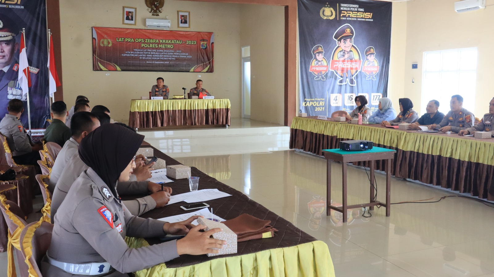 Untuk mempersiapkan dan memperlancar berjalannya Operasi Zebra Krakatau 2023 tersebut, Polres Metro menggelar Latihan Pra Operasi (Lat Pra Ops) Zebra Krakatau 2023 di Aula Sanika Satyawada dengan tema “ Melalui Latpraops Zebra Krakatau 2023 Kita Wujudkan Tertib Berlalu Lintas Guna Mewujudkan Kamseltibcar Lantas Yang Kondusif Menuju Pemilu Damai 2024 Di Wilayah Hukum Polres Metro”, Jumat (1/9/2023).