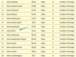Kota Metro menempati peringkat ke 14 kota secara nasional dan tertinggi se-Provinsi Lampung dengan nilai 97,21. Ini cukup membanggakan karena, capaian Metro lebih tinggi dari beberapa kota metropolitan seperti Kota Semarang dengan nilai 96,45 hingga Kota Medan peringkat ke 55 dengan nilai 91,28.